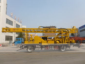 ◎u7彩票BZT400C型钻机是拖车式水井钻机,可以通过拖拉机等牵引车牵引移动,因此搬迁方便迅速、机动性好。此钻机配套108x108x7500mm方主钻杆和Φ89x5500mm副钻杆;