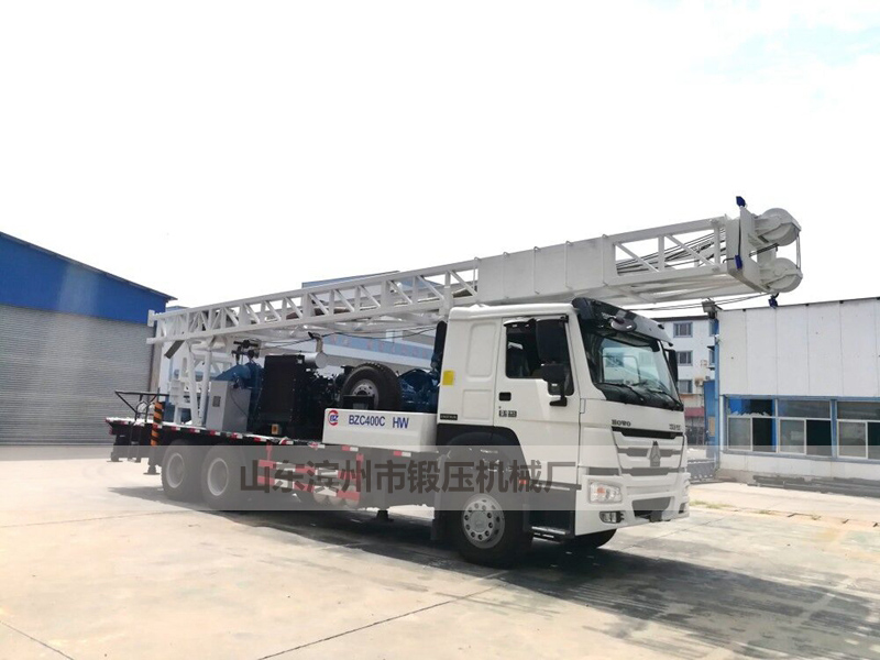 BZC400CJHW型钻机选用重汽豪沃6X4专用汽车底盘,并把动力站、双卷扬机组、泥浆泵、转盘、钻塔都装该底盘上,移运方便、机动性好。